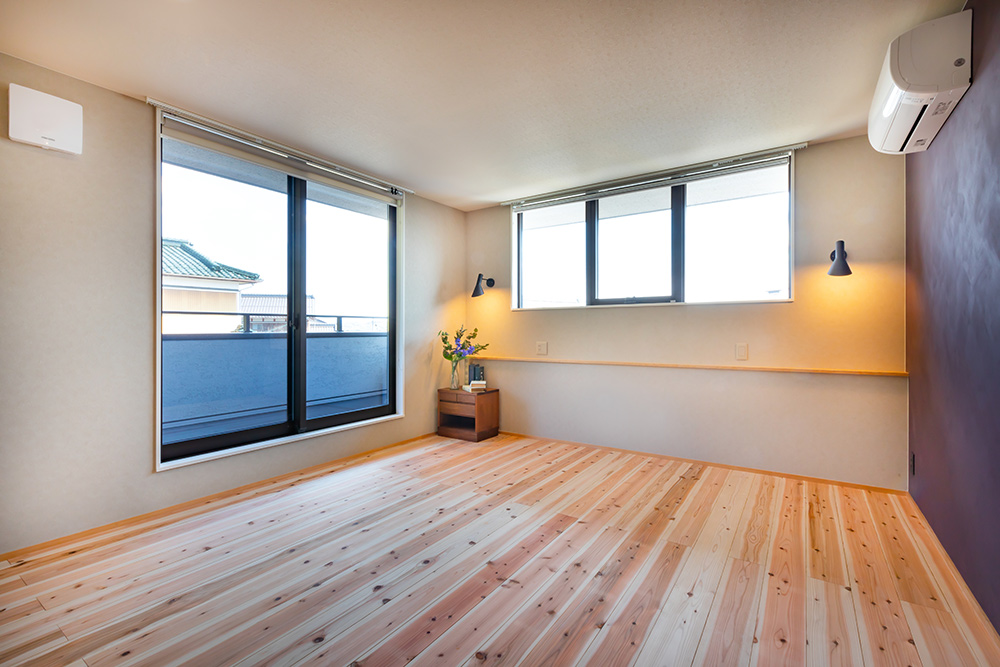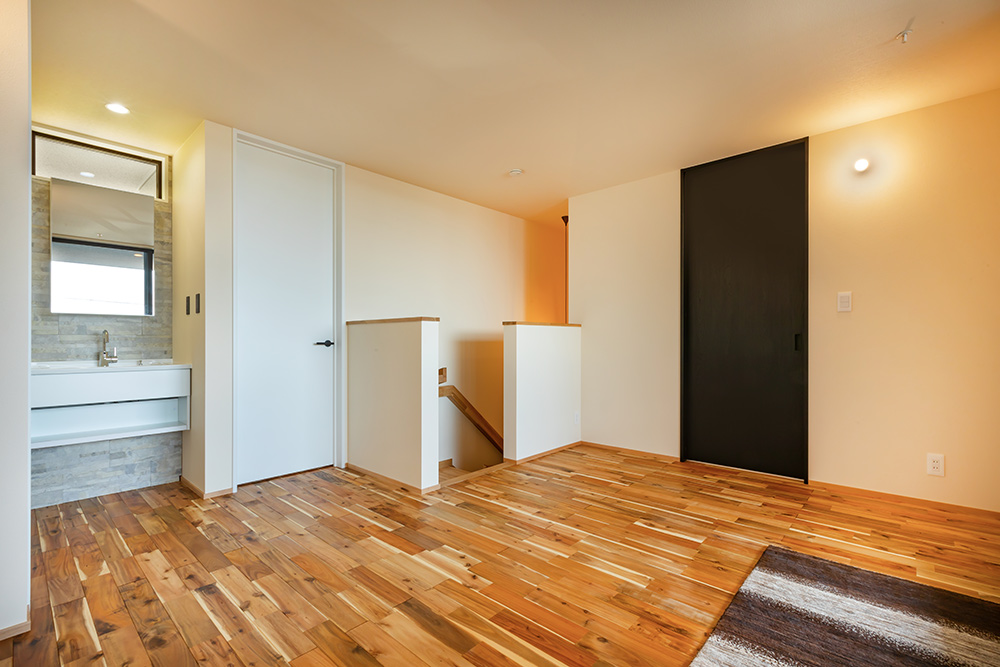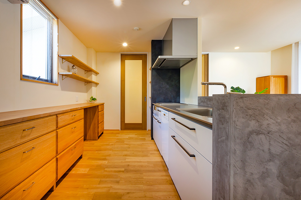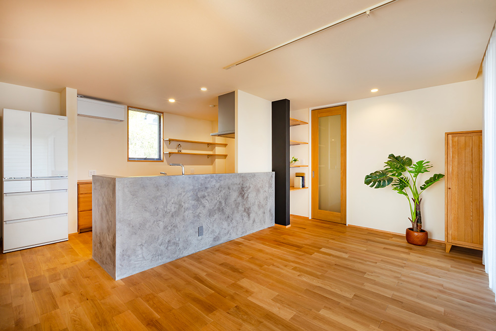 旦那様の夢であった広々としたインナーガレージや、奥様こだわりの選び抜いた無垢材、家具や照明、壁の色などお客様の理想が現実となった家となっています。